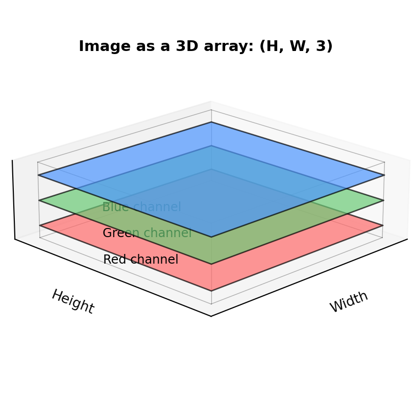Digital images are stored as 3D arrays with shape (height, width, 3)—the third dimension holds Red, Green, and Blue color intensities for each pixel: