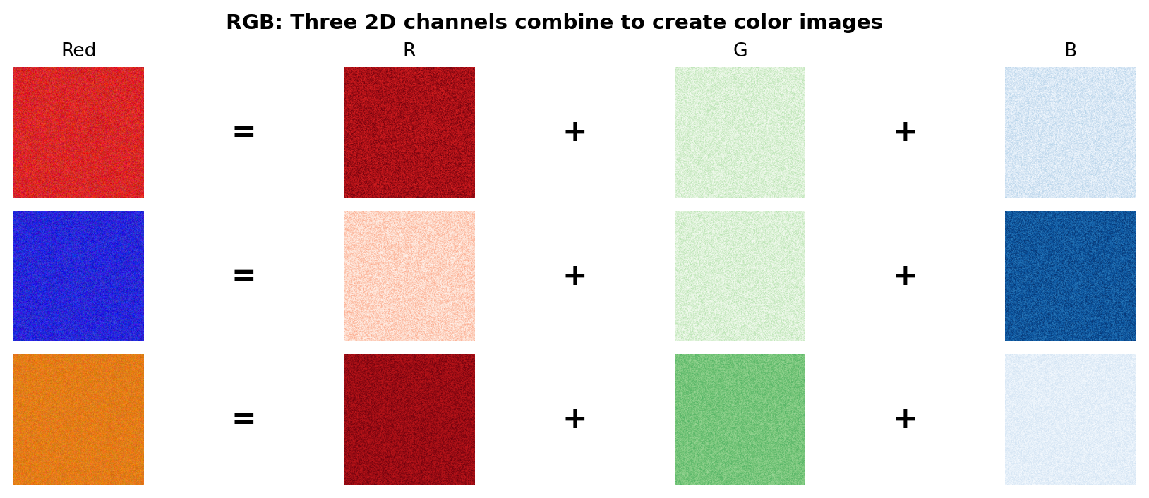 plt.suptitle('RGB: Three 2D channels combine to create color images', fontsize=11, fontweight='bold', y=0.98)