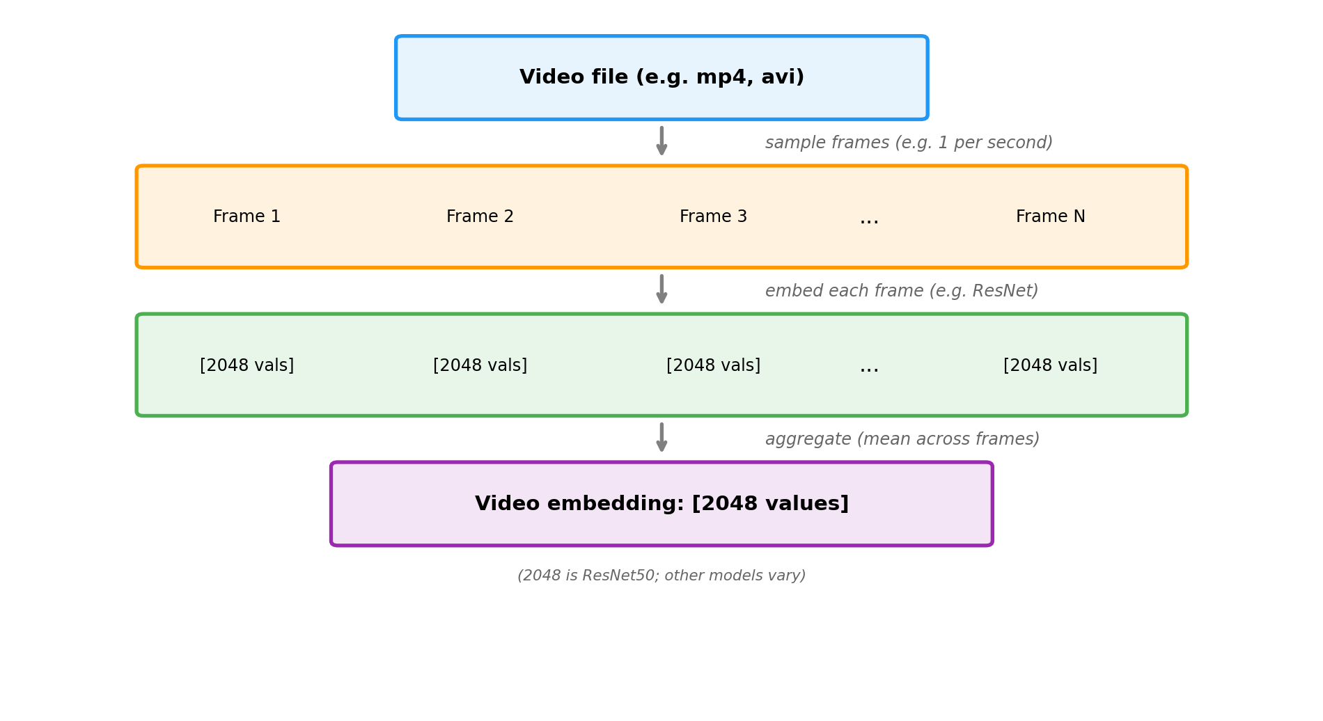 | Frame sampling + CNN | Aggregated image embeddings | Simple, fast (no motion) | Scene classification |