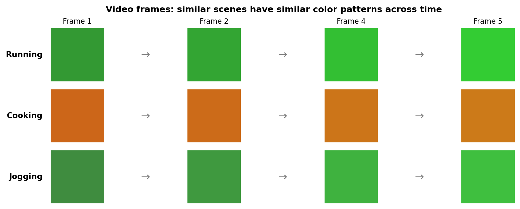 plt.suptitle('Video frames: similar scenes have similar color patterns across time', fontsize=11, fontweight='bold', y=0.98)
