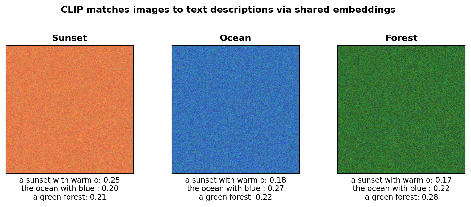 The key insight is that CLIP learns a shared space where semantically matching content—regardless of modality—has similar embeddings. The “sunset” image has warm orange pixels, and CLIP places it near the text “sunset with warm orange colors” because it learned this association from millions of image-text pairs. This enables zero-shot categorization: to categorize an image, compare it against text embeddings and pick the highest similarity—no training on your specific categories required.