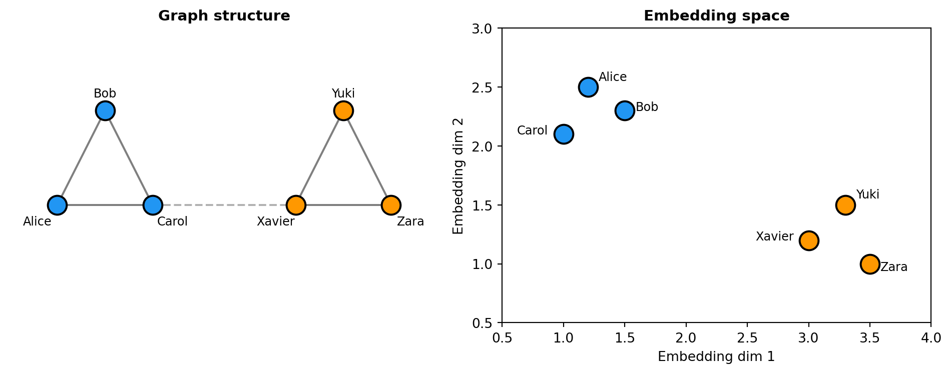 print(f" Alice ↔ Xavier: {ax:.3f}")Graph embedding similarities: